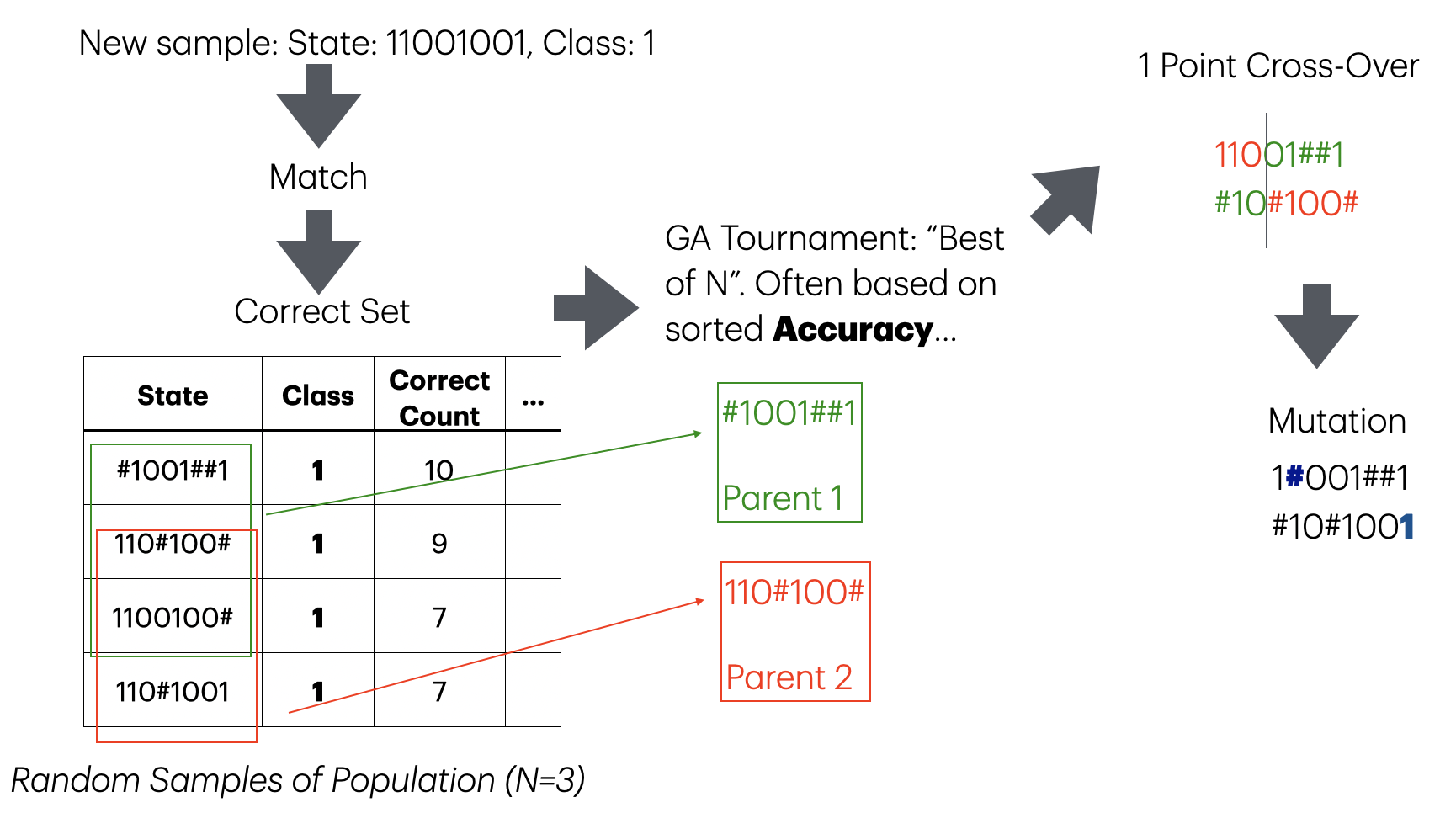Subsumption: A “perfect” classifier that has 100% accuracy might be simpler (more # characters) than other classifiers in the population with same classification. Keep only the best classifiers. (Implemented: Accuracy-based subsumption)