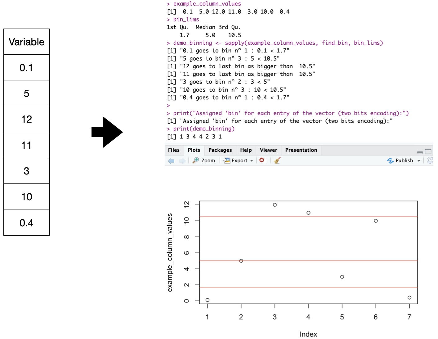 Rosetta Stone “binning” for numerical variables (2 bits explanation)