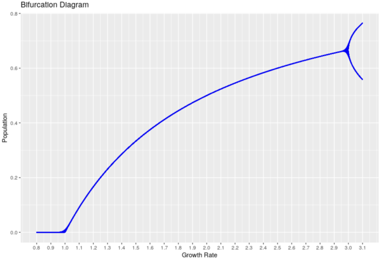 What’s interesting is that for growth ratios between 1 and 3.0, the population tends to stabilize to one specific value, which is why we see how the line grows somewhat but appears as a line: For each growth ratio in that range, the population stabilizes to one value. (What you can’t really see is that, in fact, there are many dots on each position of the line, one for each generation: For a given growth ratio, the population is stable at that particular value).