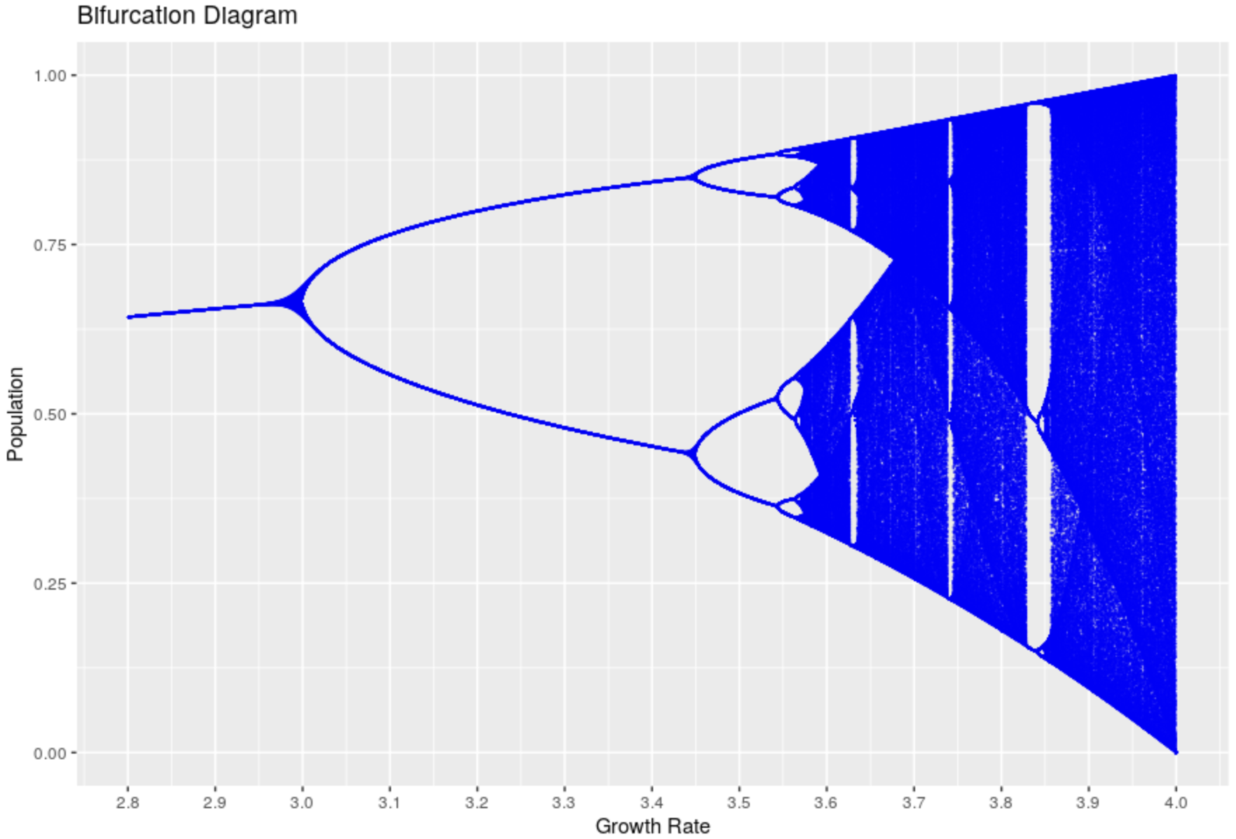 Before a growth of ~3.45, more possible values appear, then again at ~3.54. But then the number of individuals in each generation seems to become “random”, and takes any value within some ranges, which is why we don’t see “lines” anymore, but rather clouds of points.