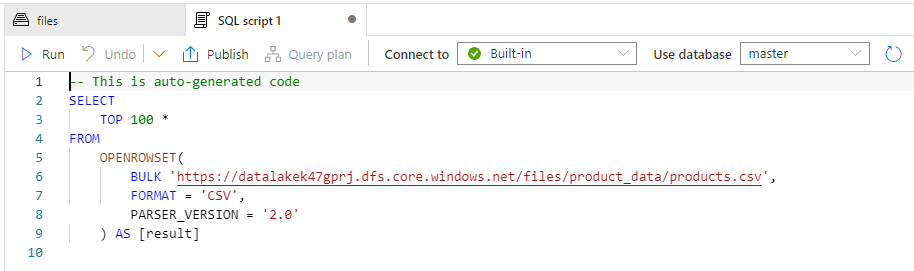 Things get powerful when to work using SQL code with a CSV, all you need to do is “load” the CSV as an input to a “serverless” SQL resource pool.