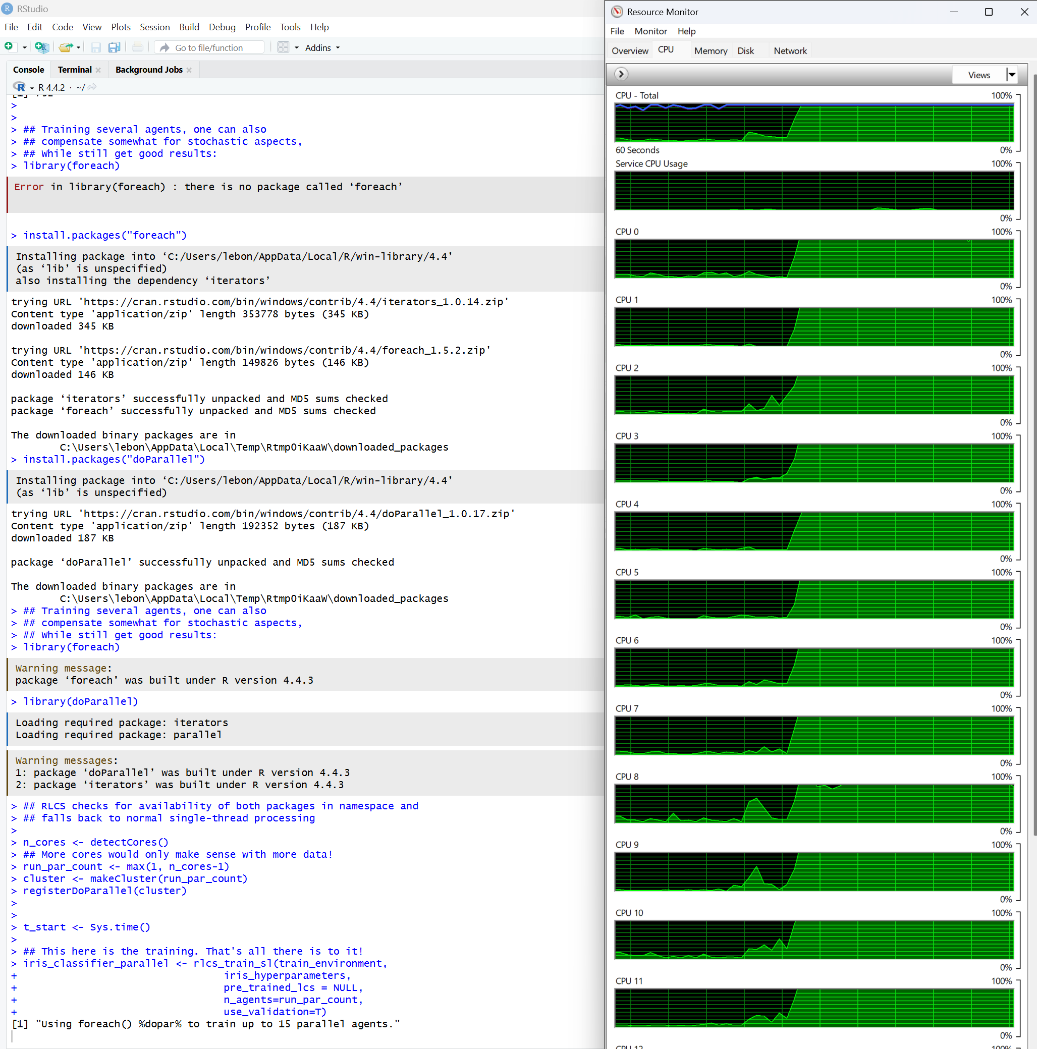 Alright, so I have this miniPC with 16 threads, and for the past weeks I was looking at my MacBook M1 screen while waiting for 7 parallel processes to run instead of using that alternative machine… And because I was testing different configurations and doing a sort-a Monte-Carlo, whereby I would run 50 times each configuration (to compare accuracy with RF, Rpart and now also a simple NeuralNet), but each complicated config I would use for RLCS would take 40s-1m20s, times 50, well…