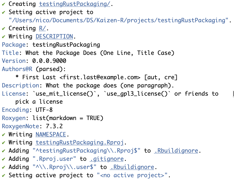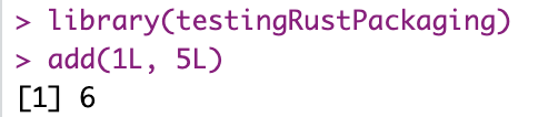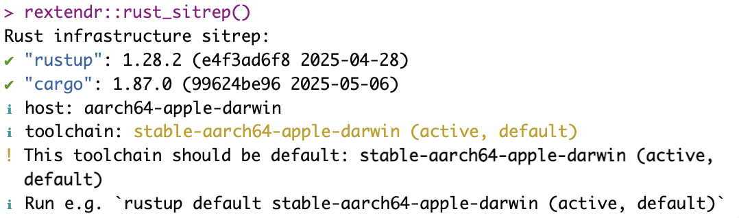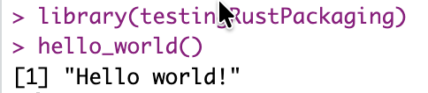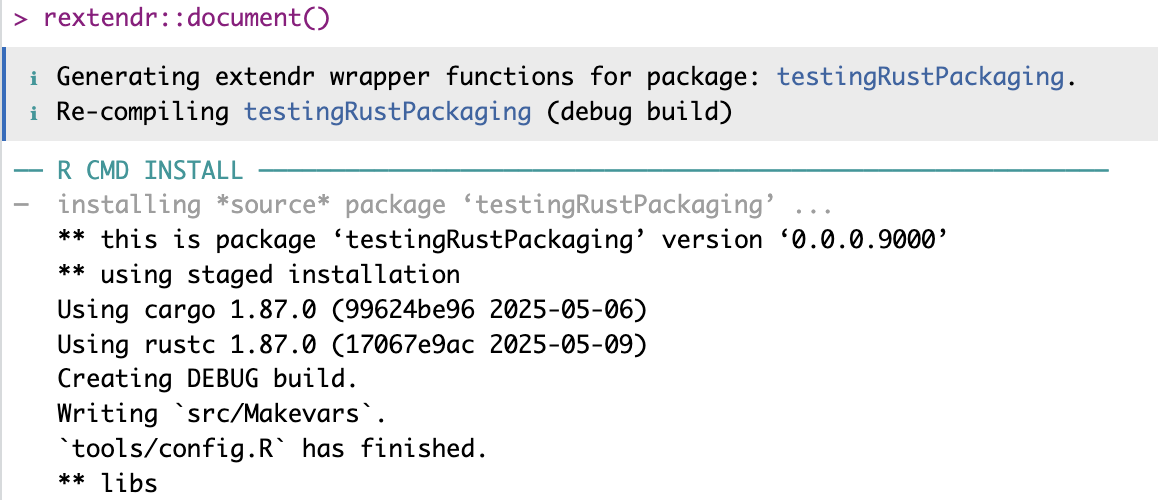 Once you’re there, you’re actually two steps away from running your first Rust function call from R. I called my new package “testingRustPackaging”, and the sitrep is optional (but I’d recommend to run it first regardless, just in case an error shows up there):