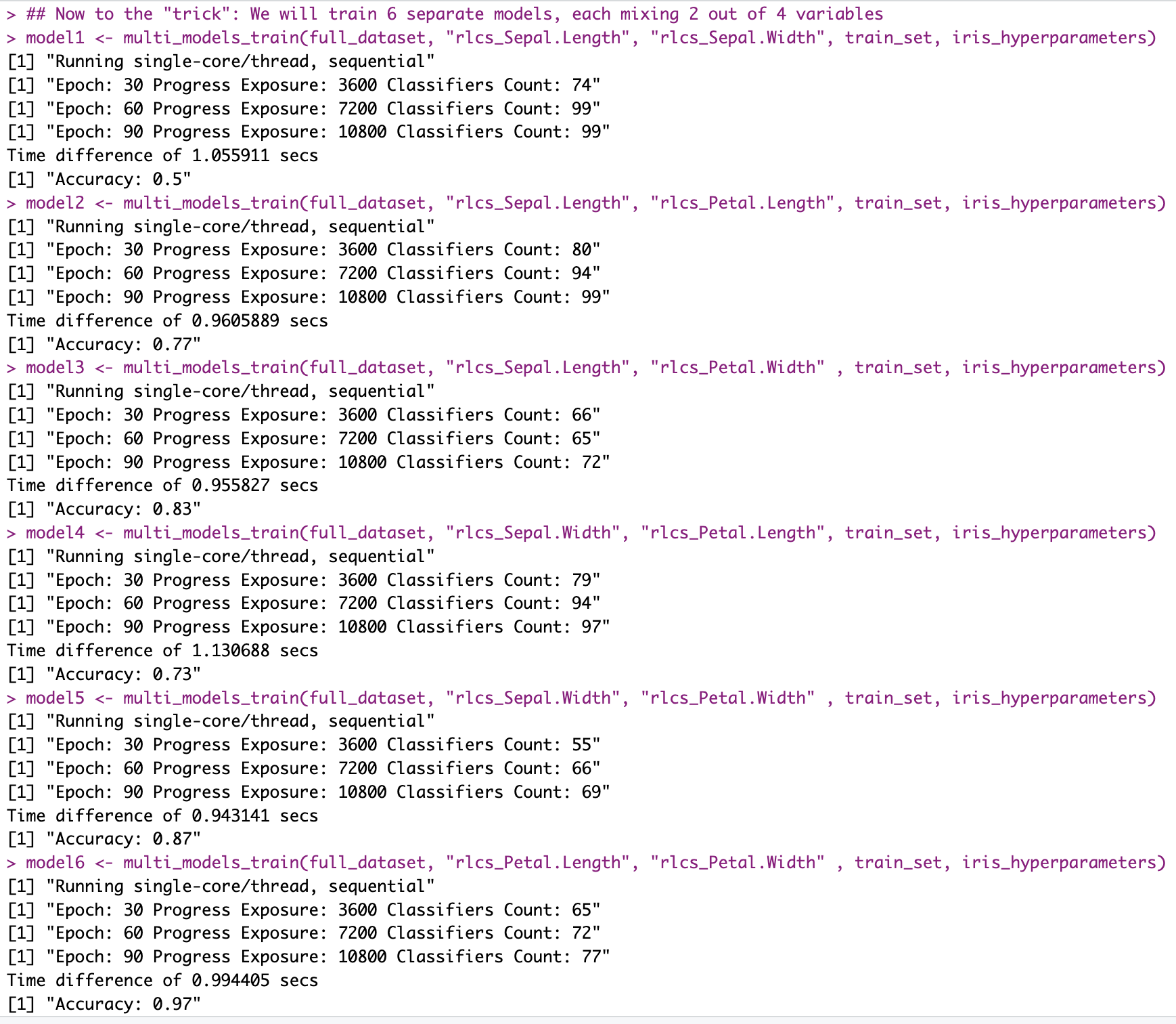 I can train 6 models using pairs of variables in 6 seconds (not parallelizing anything, which here would be an obvious next step…).